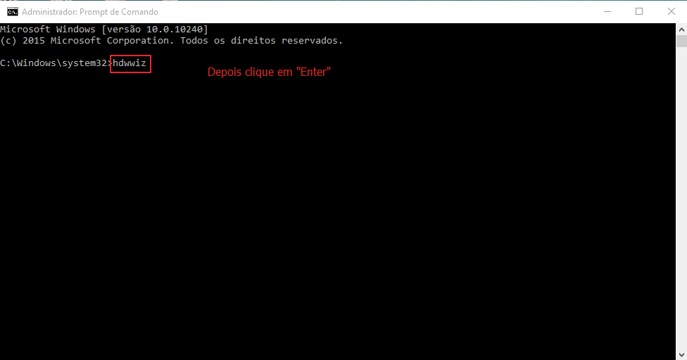 - Abra o prompt de comando do Windows como administrador e execute o seguinte comando ” hdwwiz “, conforme mostrado na imagem abaixo.