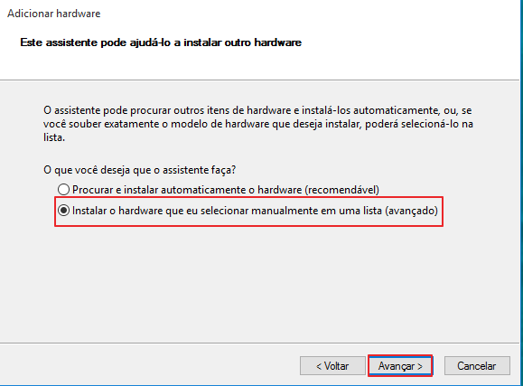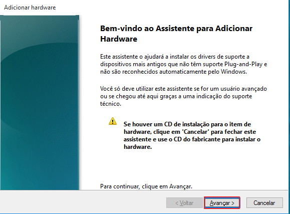 Ao executar o comando mostrado na imagem acima, ira aparecer o assistente para adicionar Hardware, clique em avançar assim como mostrado na imagem a seguir.