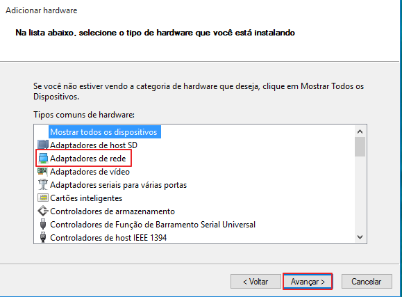 Nesta próxima tela selecione Adaptador de rede, conforme mostrado na imagem e depois em avançar
