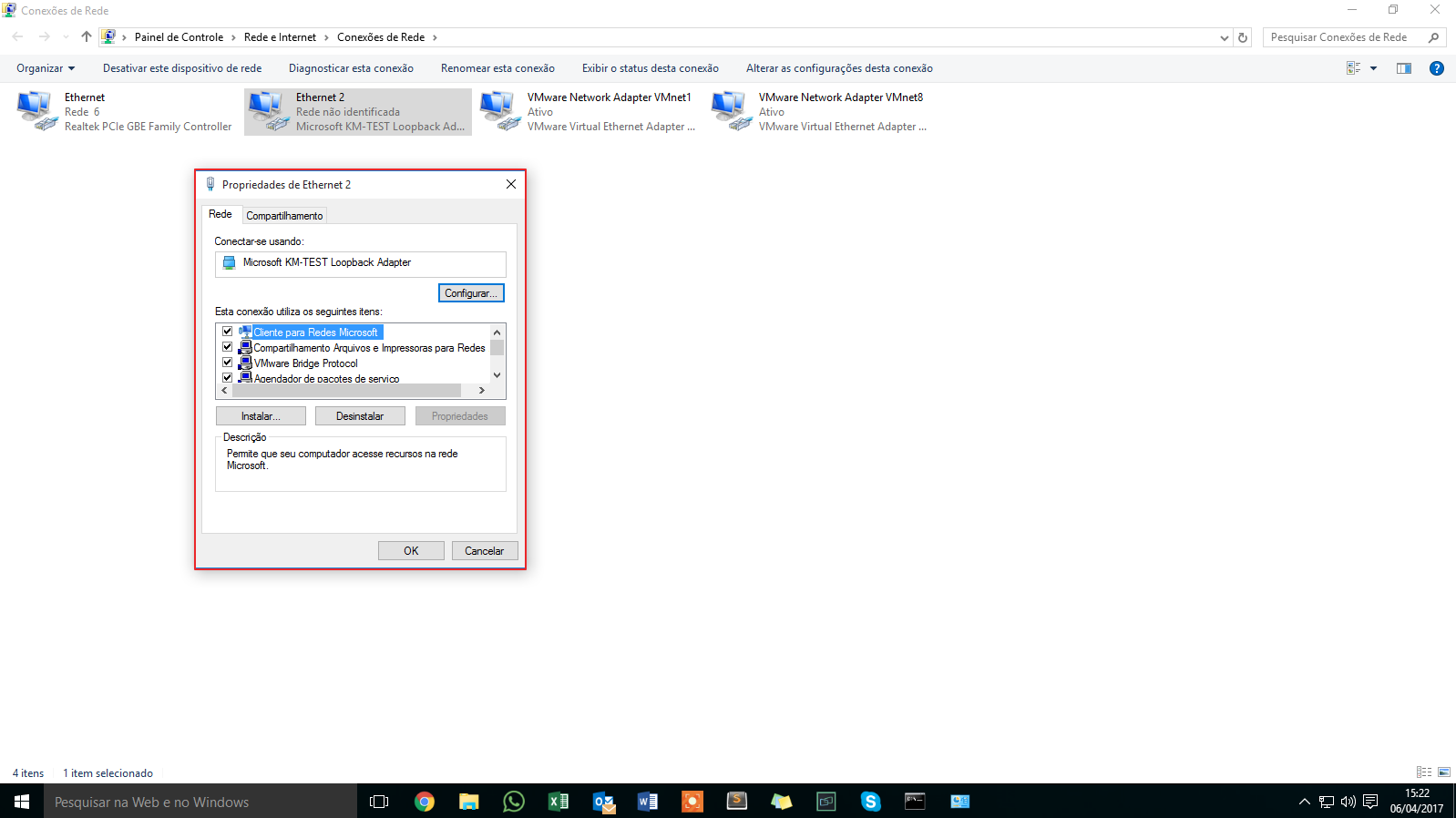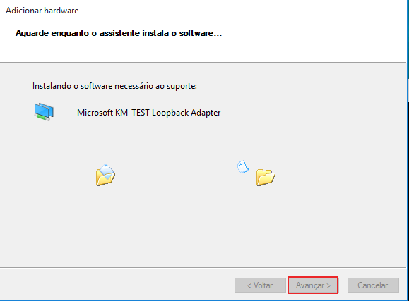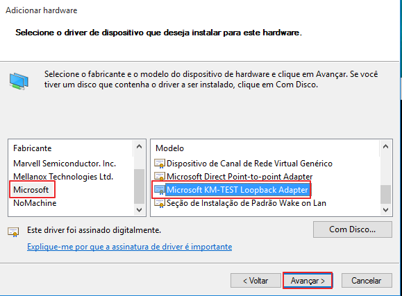 Na próxima tela escolha as seguintes Opções “Microsoft e Microsoft KM-TEST Loopback Adapter”, conforme mostrado na imagem abaixo.