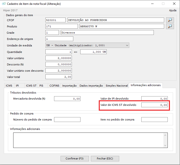 Obs: outra forma de destacar na nota o valor de ICMS ST, é adicionar o valor do ST no na aba informações adicionais, no campo “Valor de ICMS ST devolvido”, conforme imagem a seguir