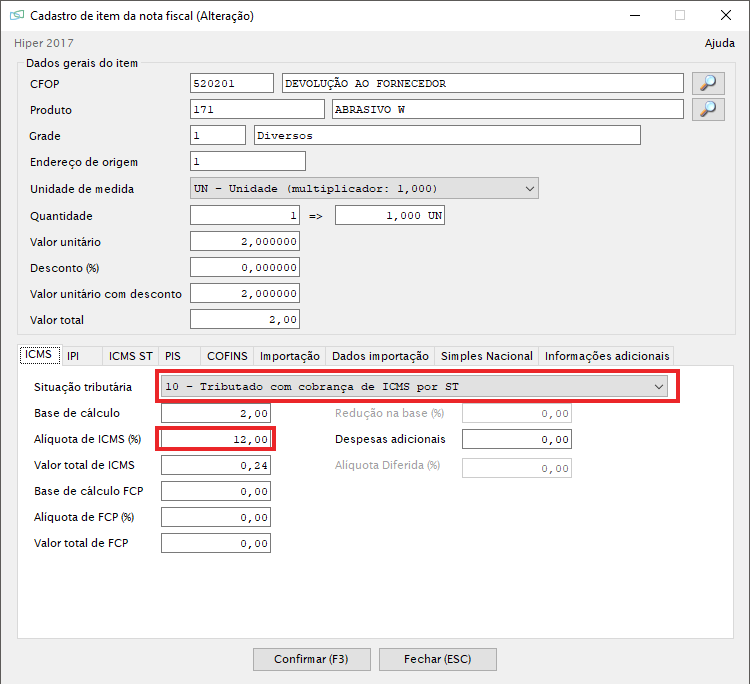 01 – Defina a situação tributária do ICMS para 10 e a base de calculo, conforme mostrado mais abaixo na Imagem: